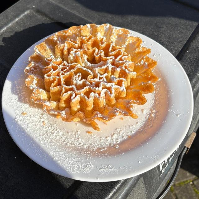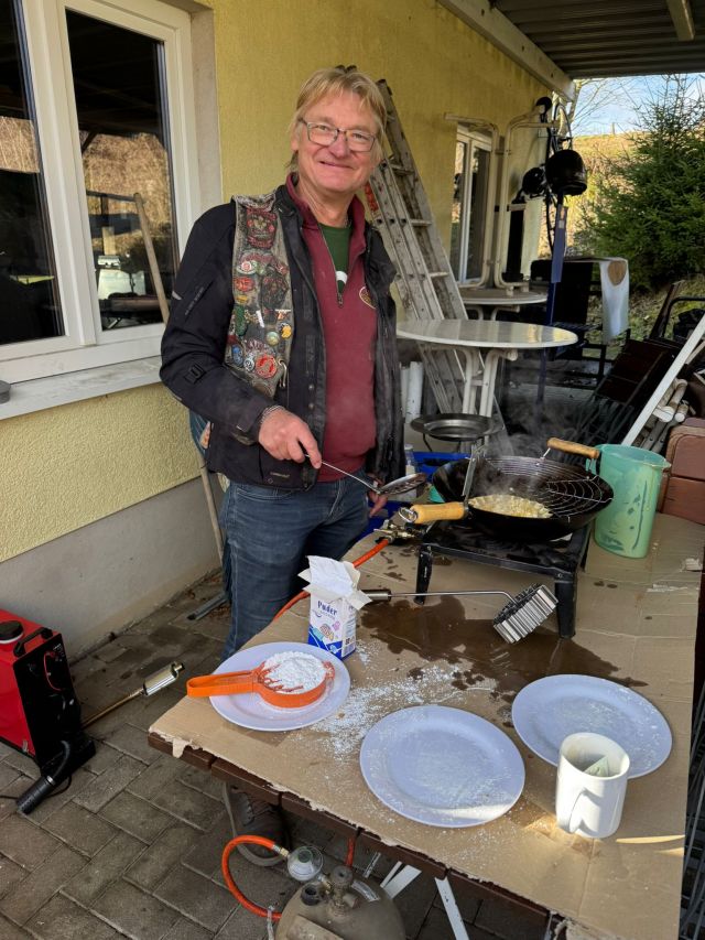 Als leckeren Snack bot Fritz wieder seine Rosenküchle an, die er frisch in Öl backte und die mit großer Freude in der Sonne verspeist wurden.