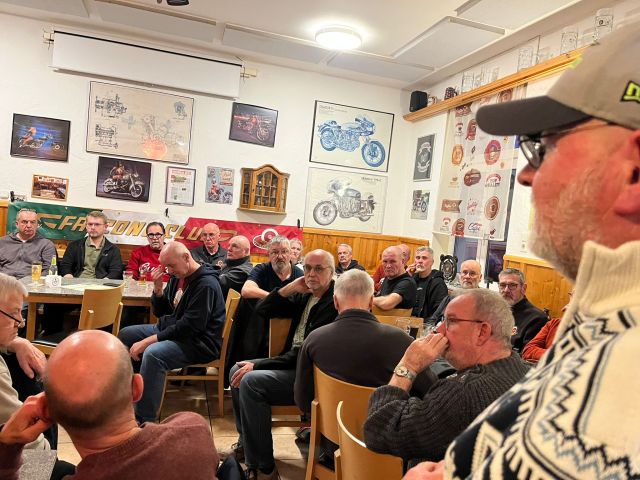 es wurden viele Fotos von vergangenen Treffen und Veranstaltungen aus mehreren Jahrzehnten, die Jürgen gesammelt hatte, mit einem Beamer gezeigt . Zusätzlich gab es noch einen schönen Fotobericht von der Guzzino-Fahrt nach Mandello vom letzten Jahr und ein toll gemachtes Video von der Rennveranstaltung in Varano vom letzten Jahr.